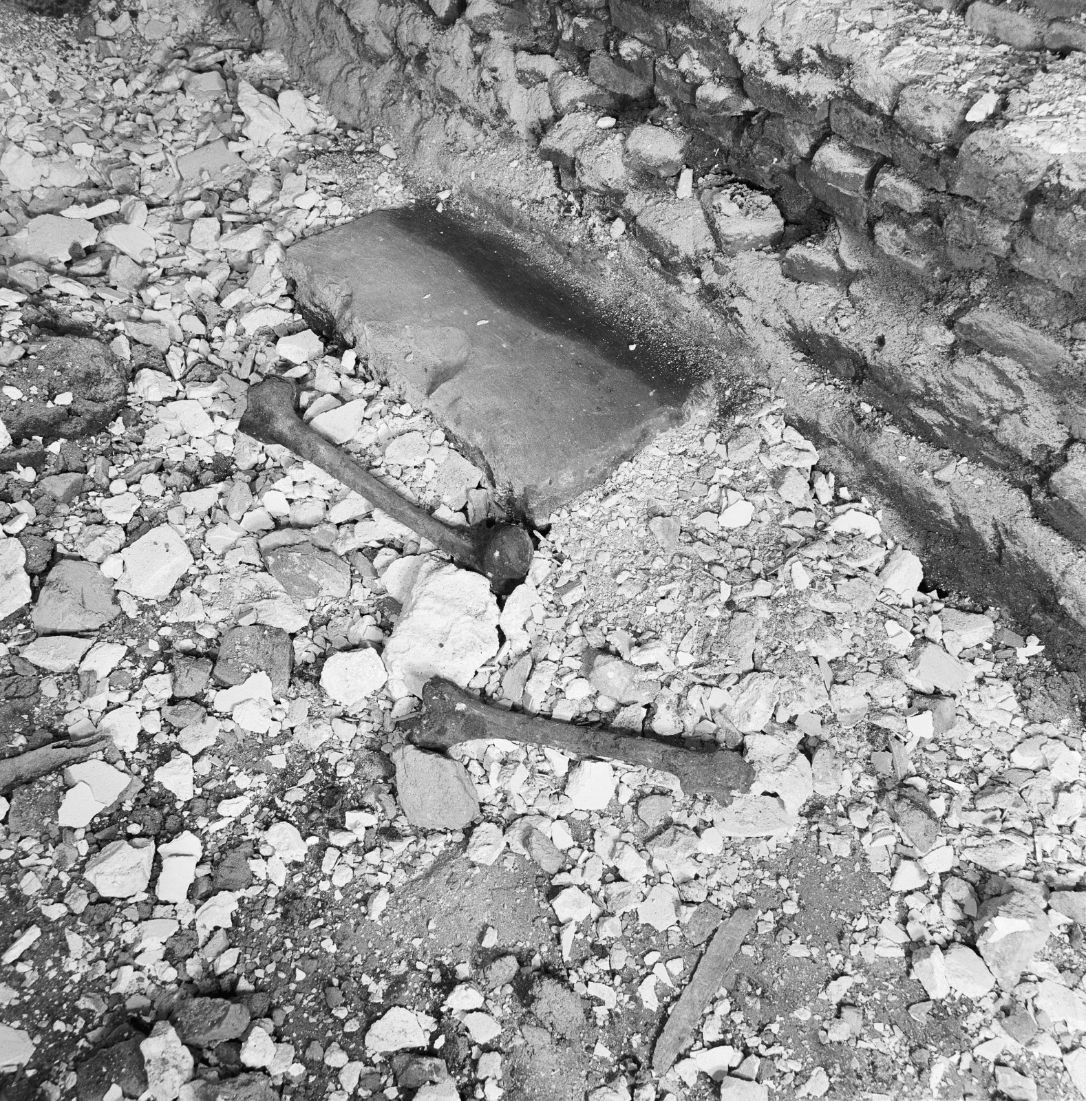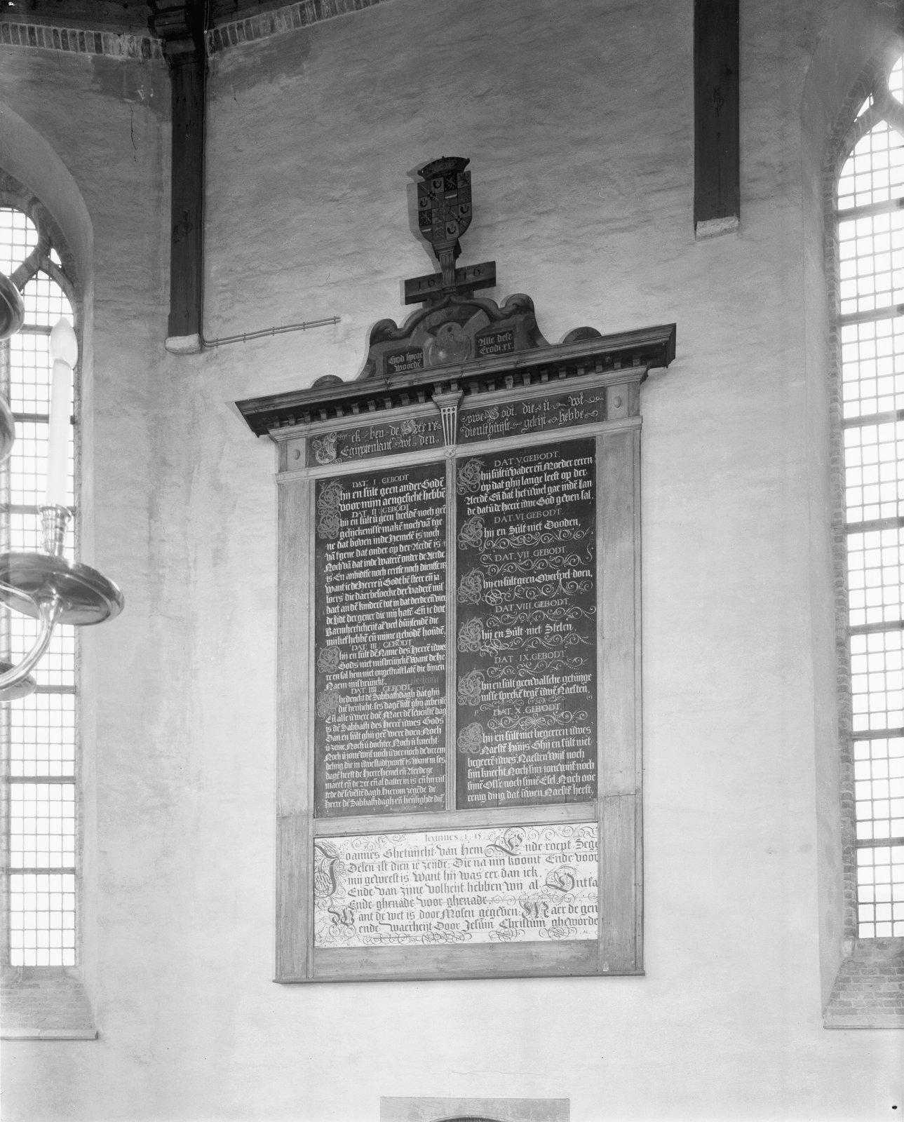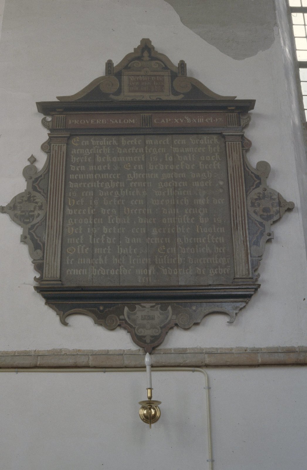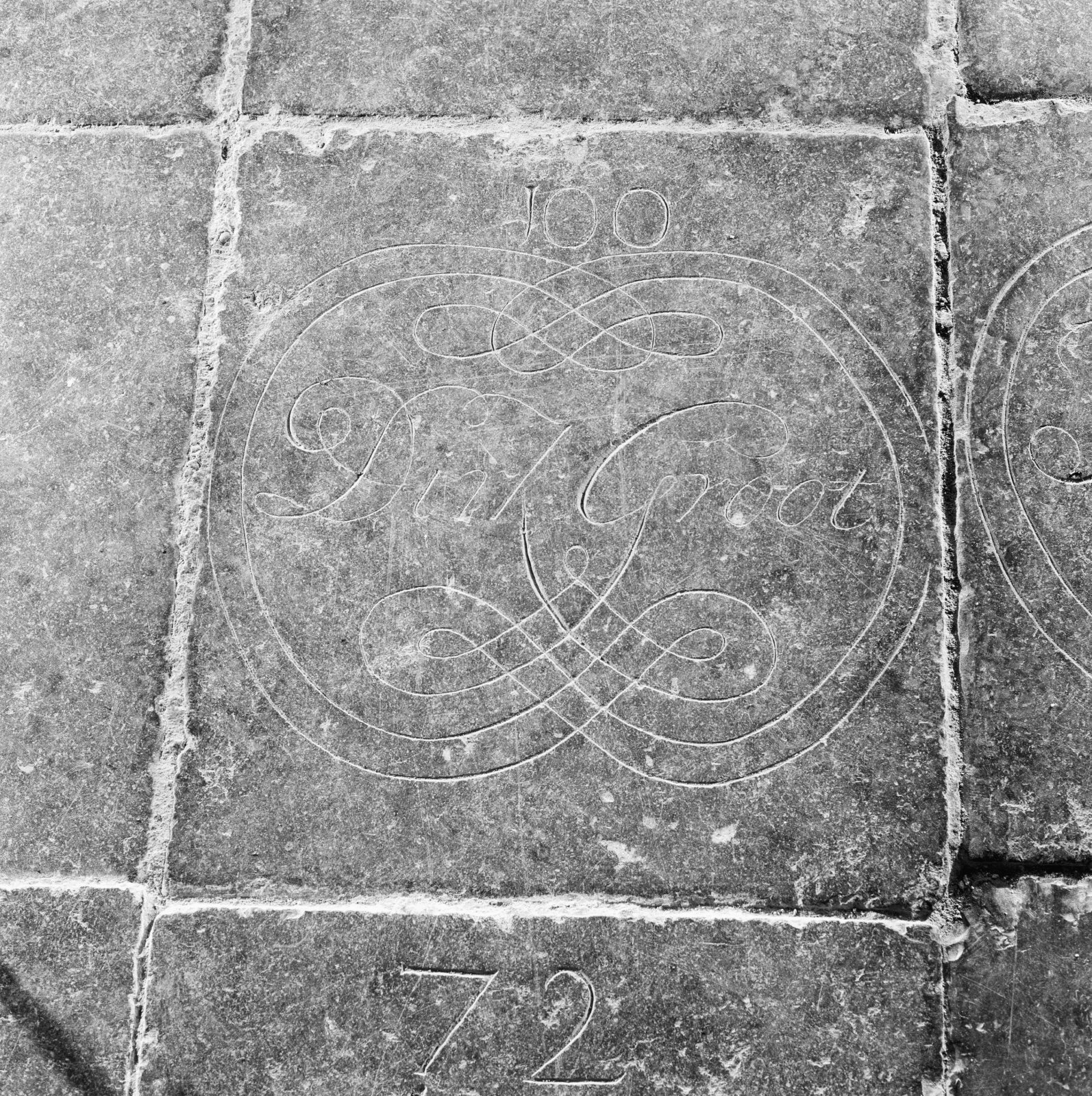 Interieur, grafzerk met gekalligrafeerd opschrift