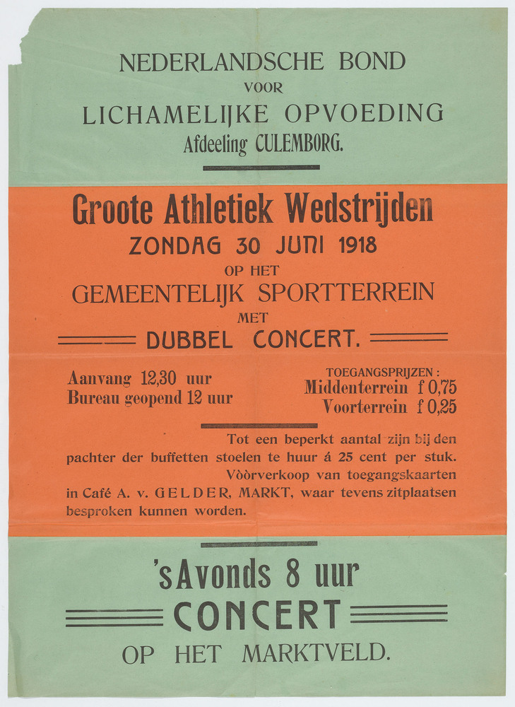 Affiche met aankondiging atletiekwedstrijd en concer...