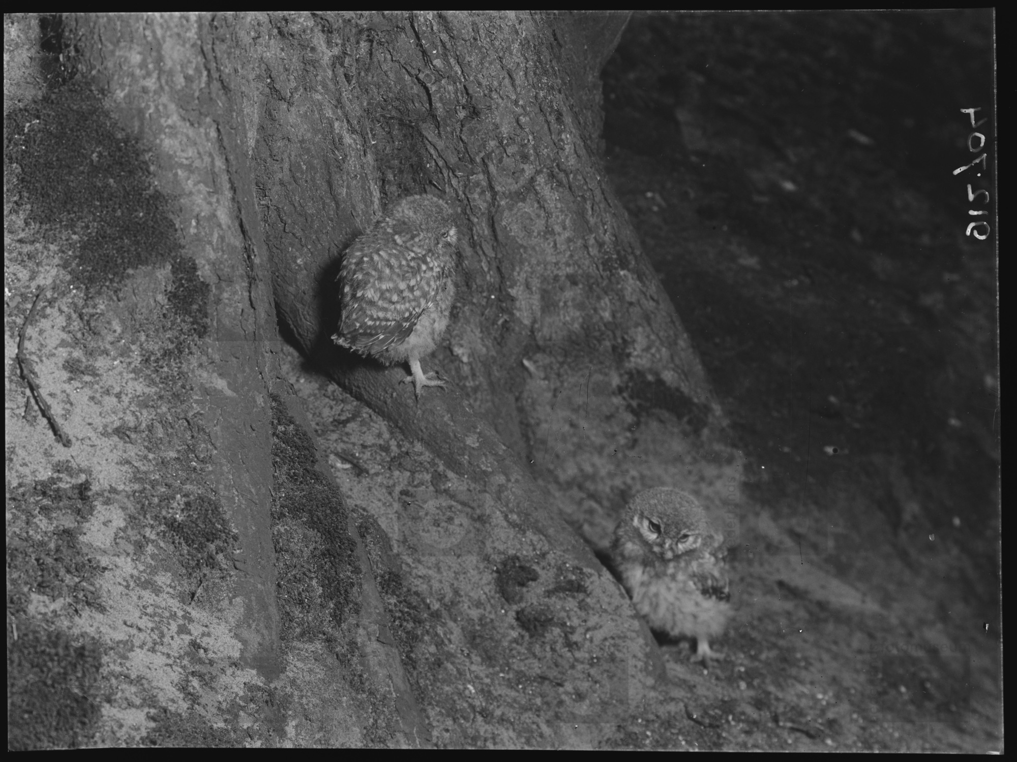 Twee jonge steenuilen [in omgeving van nest], z.pl. ...
