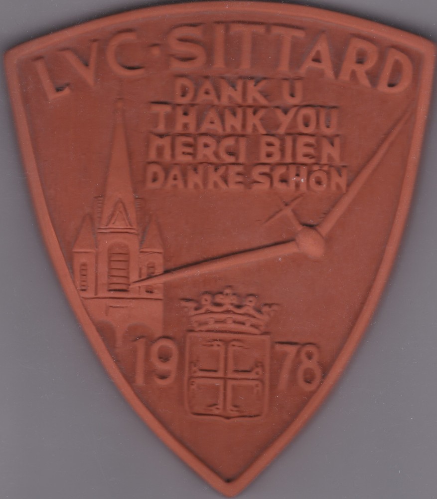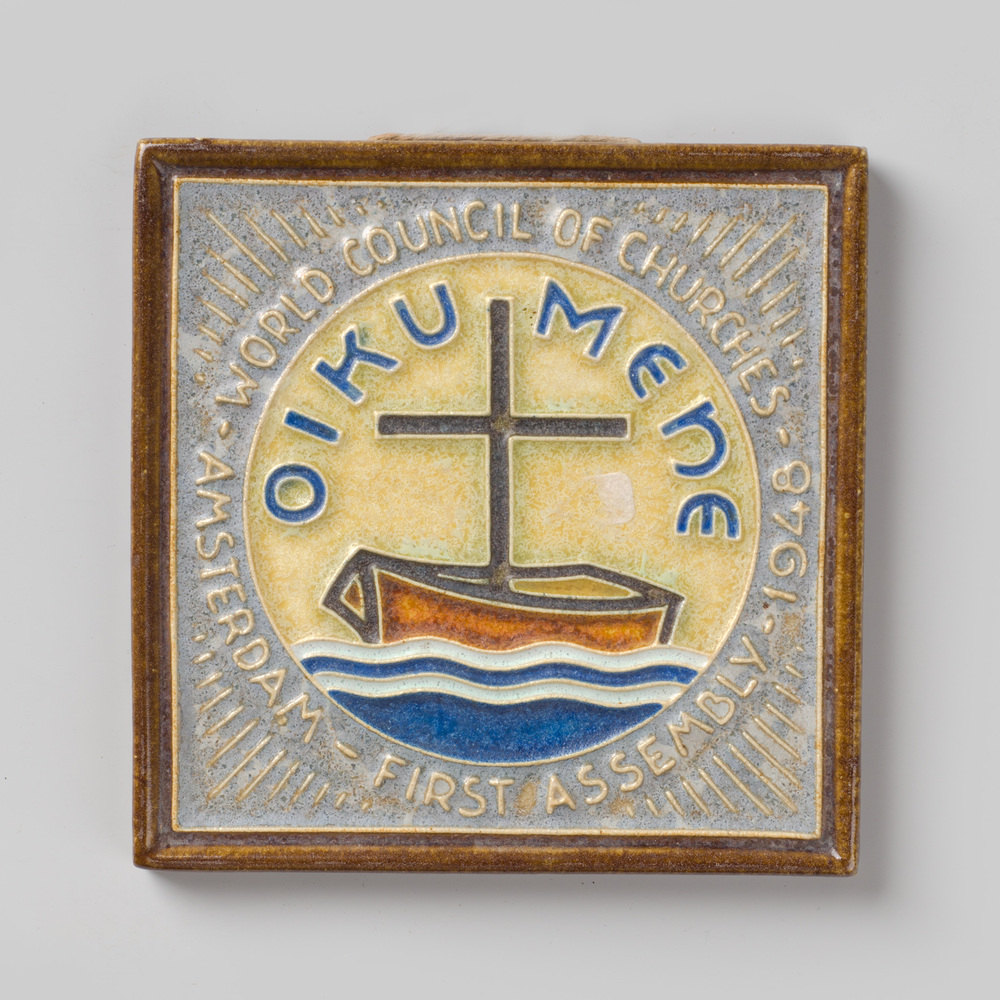 Tegel in reliëf, met voorstelling: kerk met vliegtui...