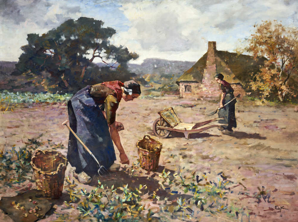 Locomotiefhuisje met 2 aardappelrooiende vrouwen.