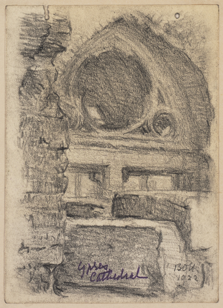 Een portaal van de kathedraal te Ieperen met ruïne-s...