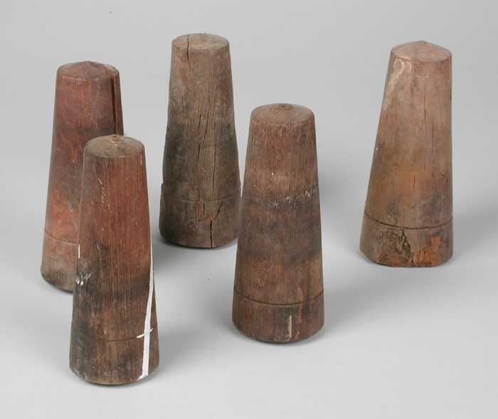 Vijf houten stoppen voor wijnvaten ofwel bondels, ge...