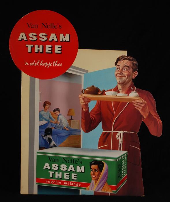 Reclamebord van Van Nelle's "ASSAM THEE", vader bren...