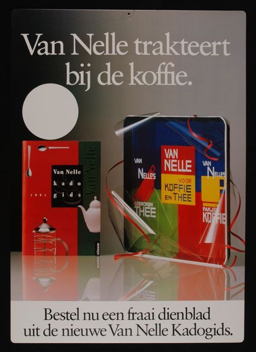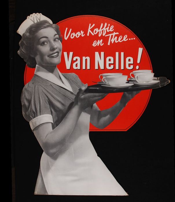 Reclamebord Van Nelle's koffie met dienblad en kadogids