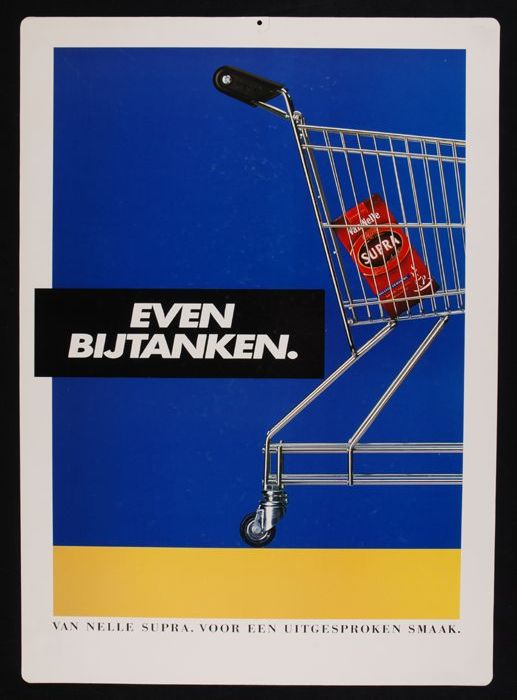 Reclamebord Van Nelle's "Supra Koffie" met winkelwagen