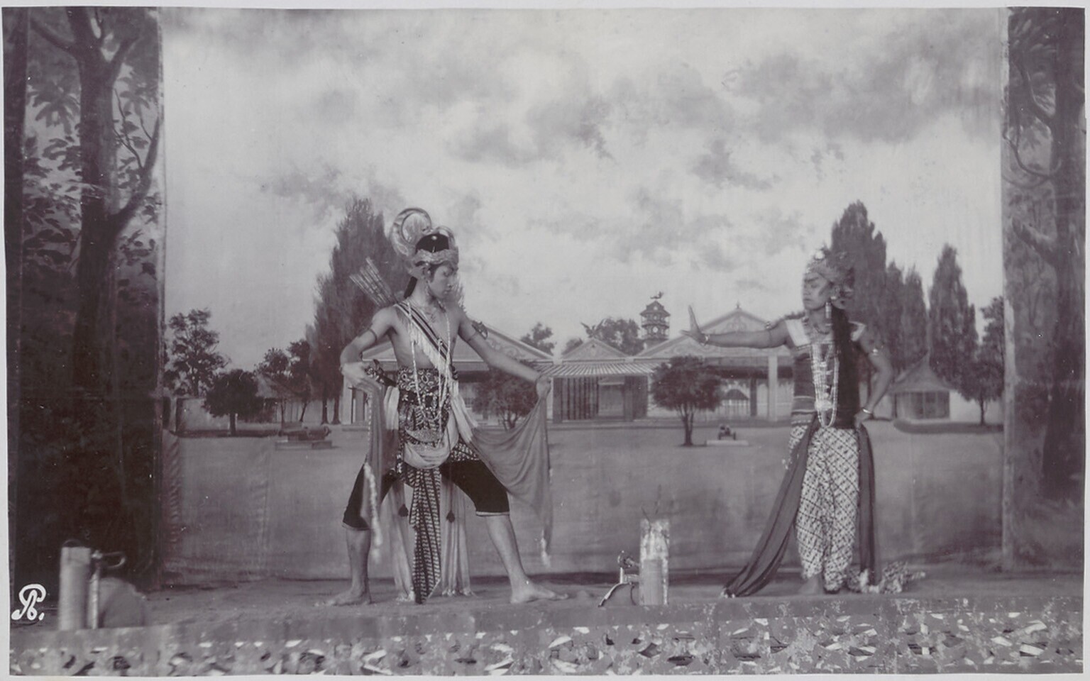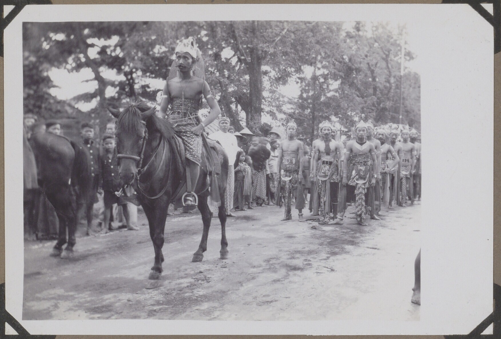 Toeschouwers kijken naar in dansornaat geklede deeln...