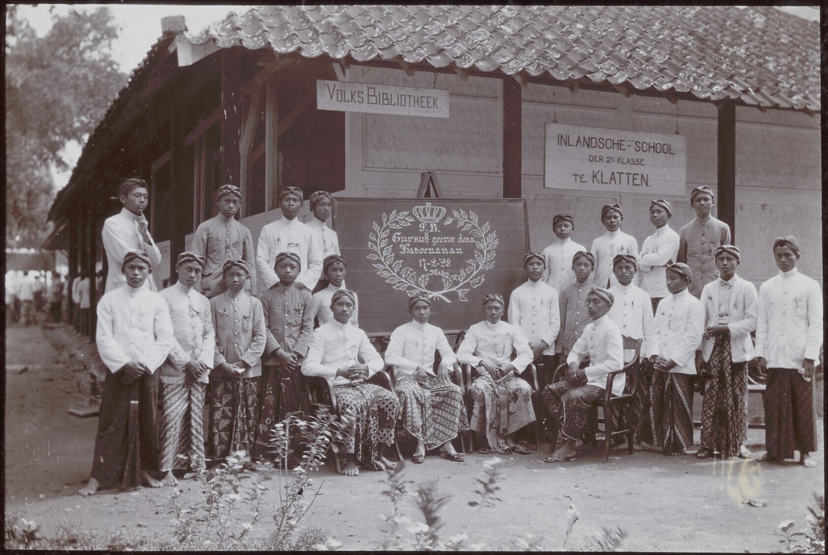 Deelnemers aan de cursus Goeroe Desa Kasoenanan pose...