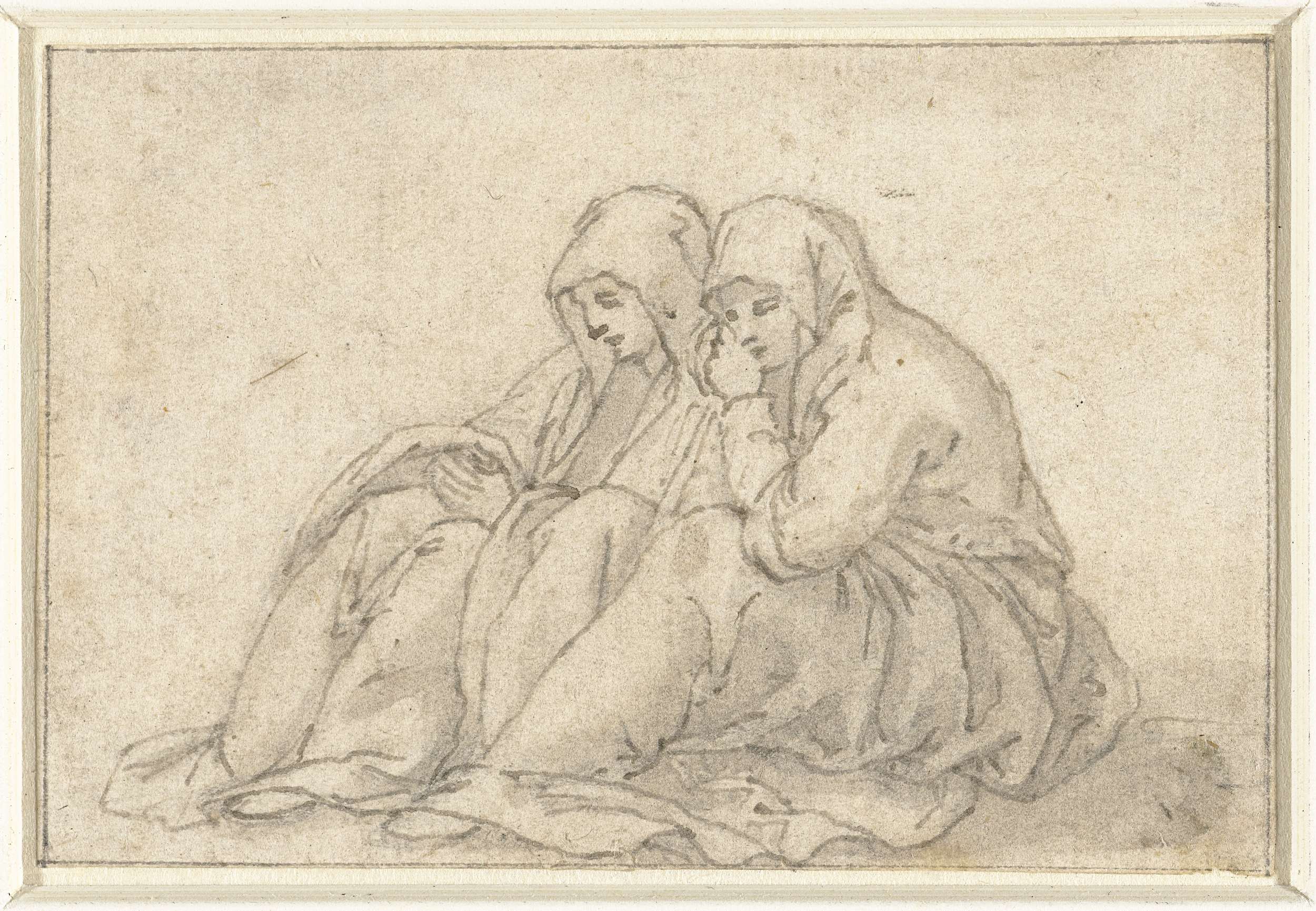 Twee op de grond zittende, treurende vrouwen