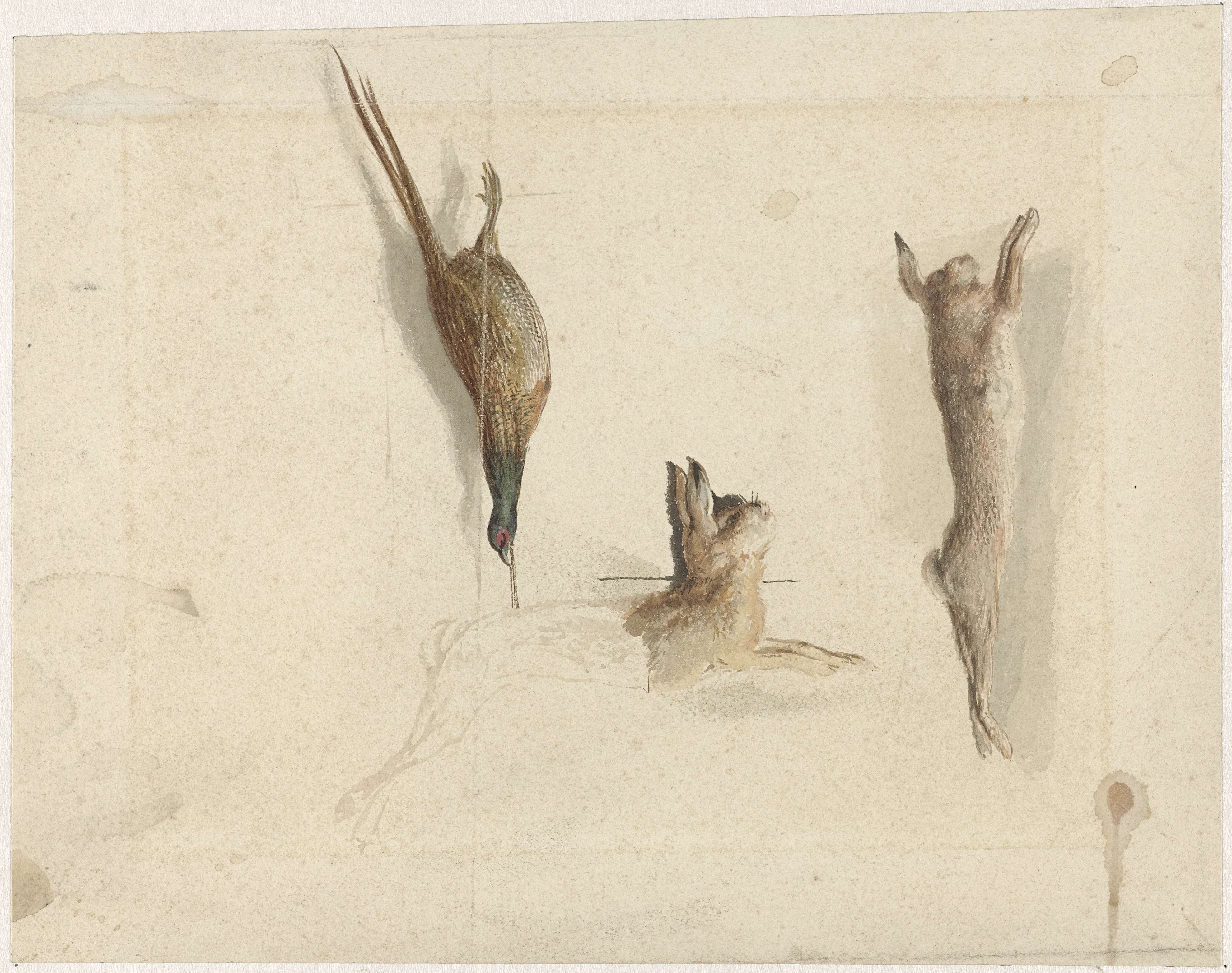 Dode fazant en twee dode hazen