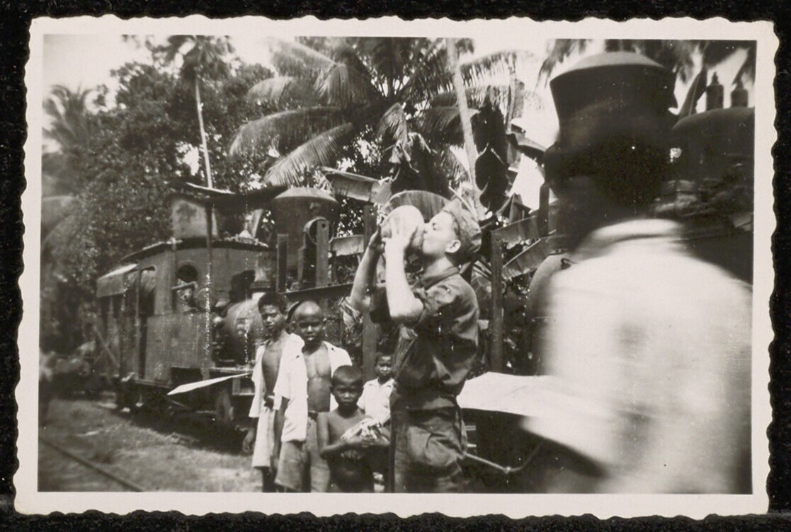 A Dutch soldier drinking a coconut on a trip by trai...