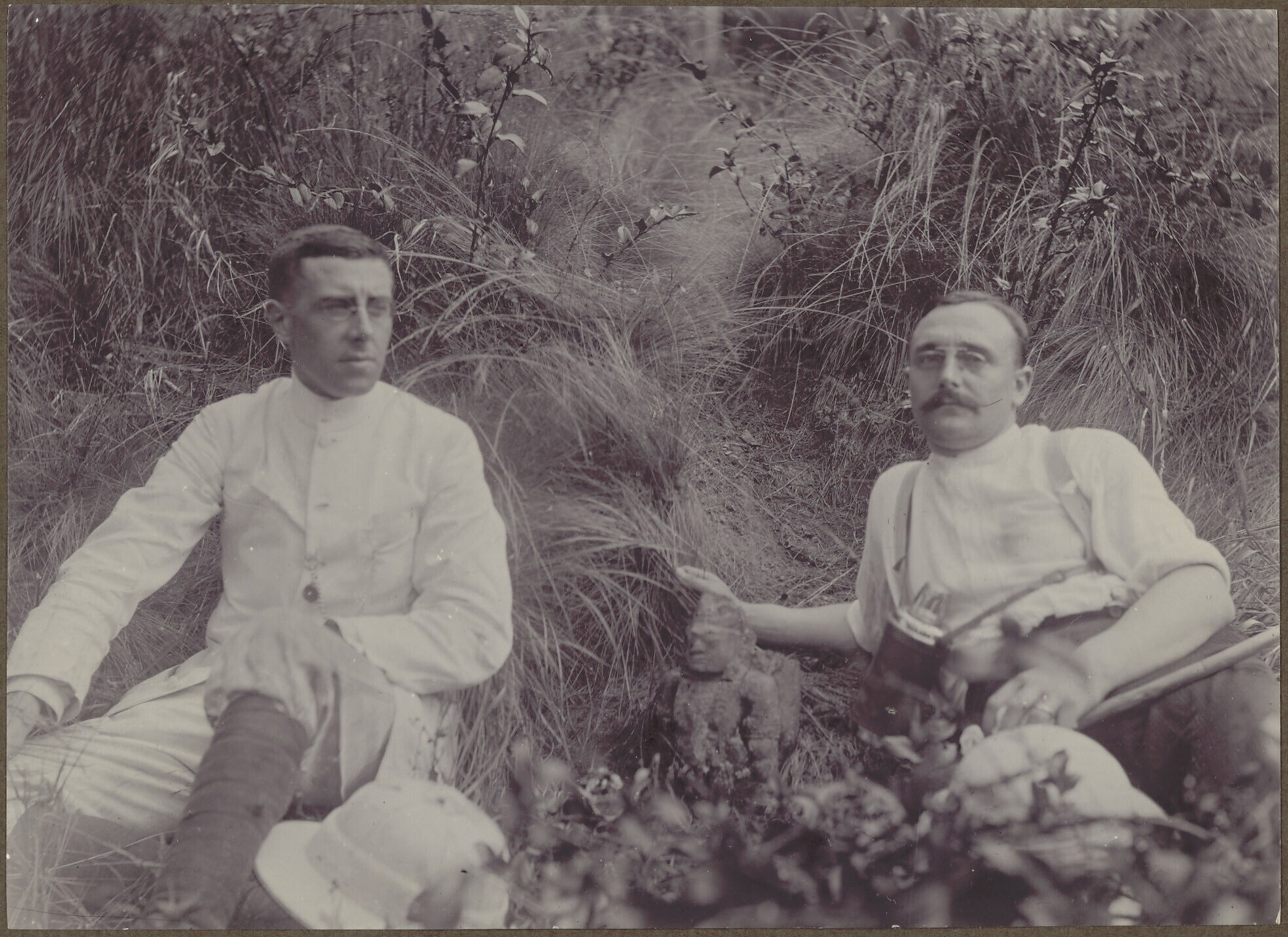 Twee Europeanen, met in hun midden een stenen beeld,...