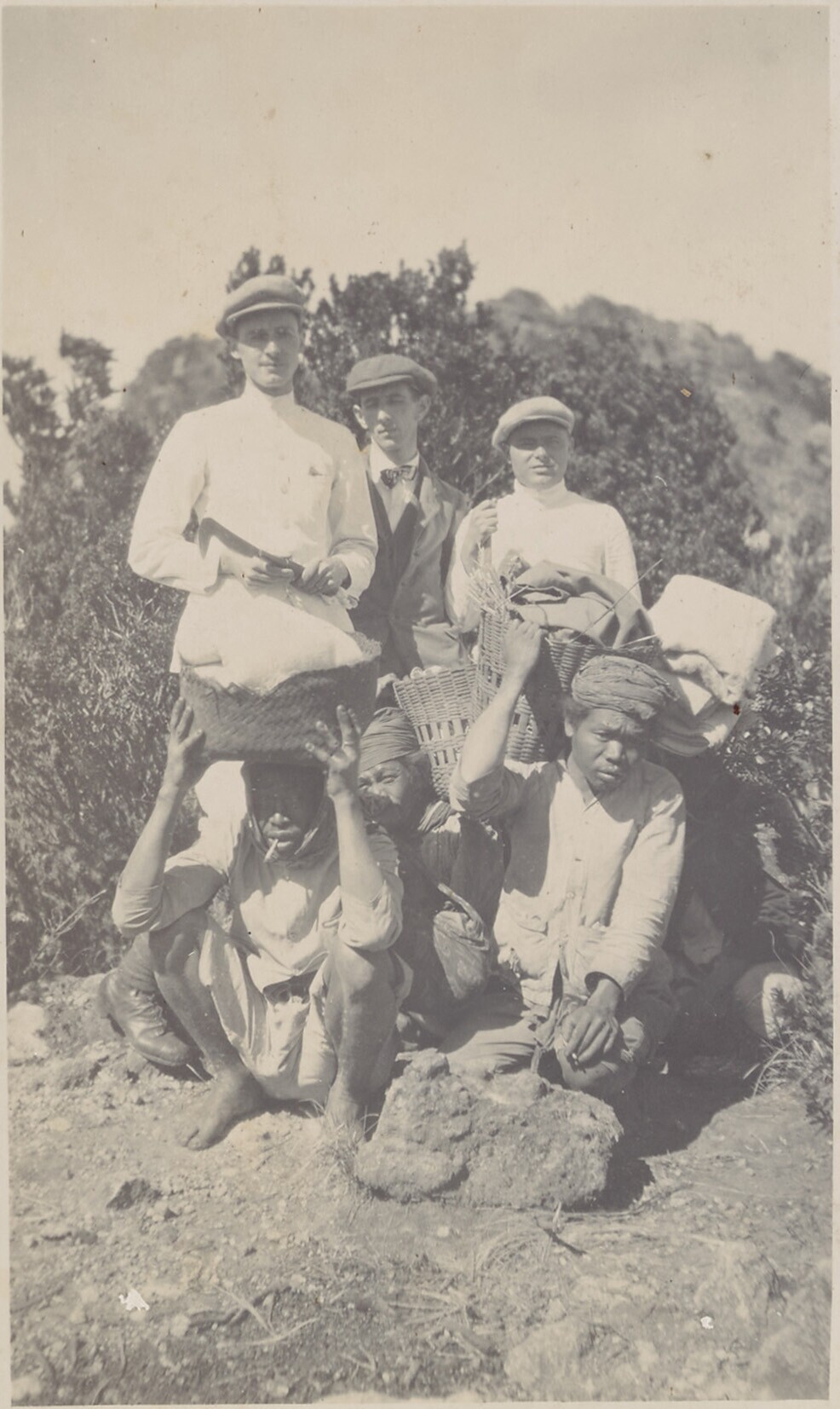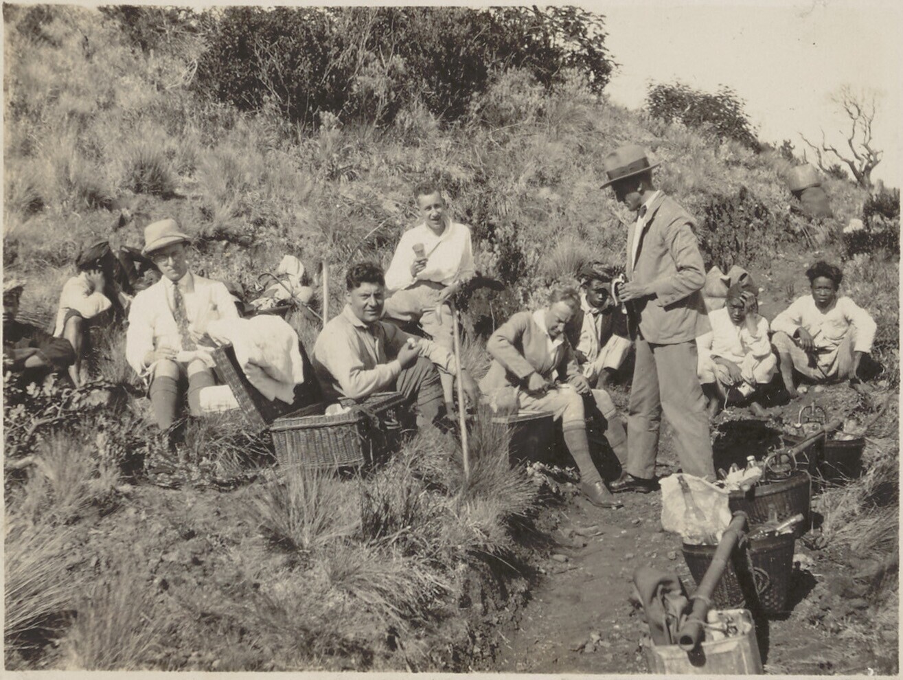 Een groep etende Europese mannen tijdens een beklimm...