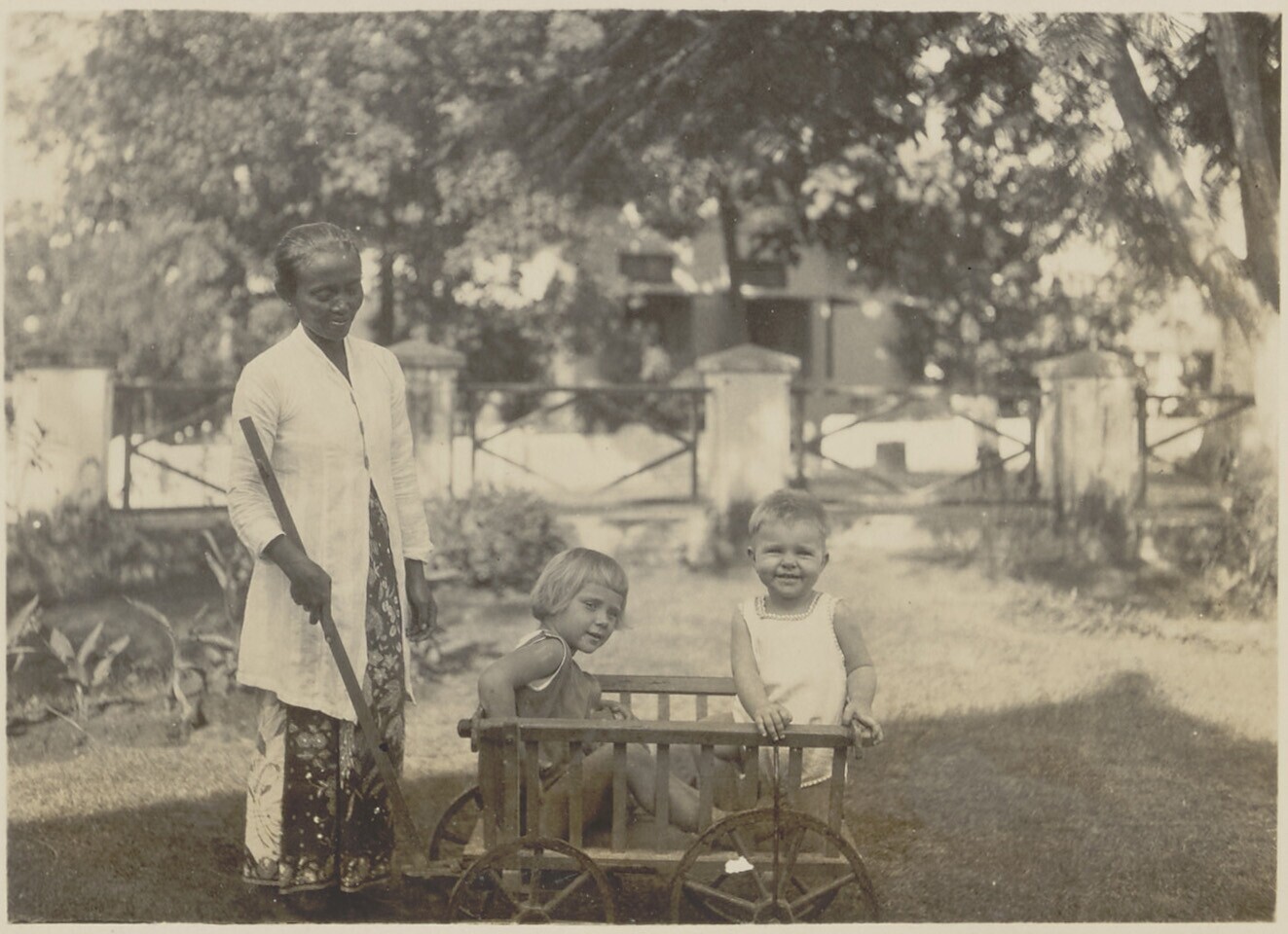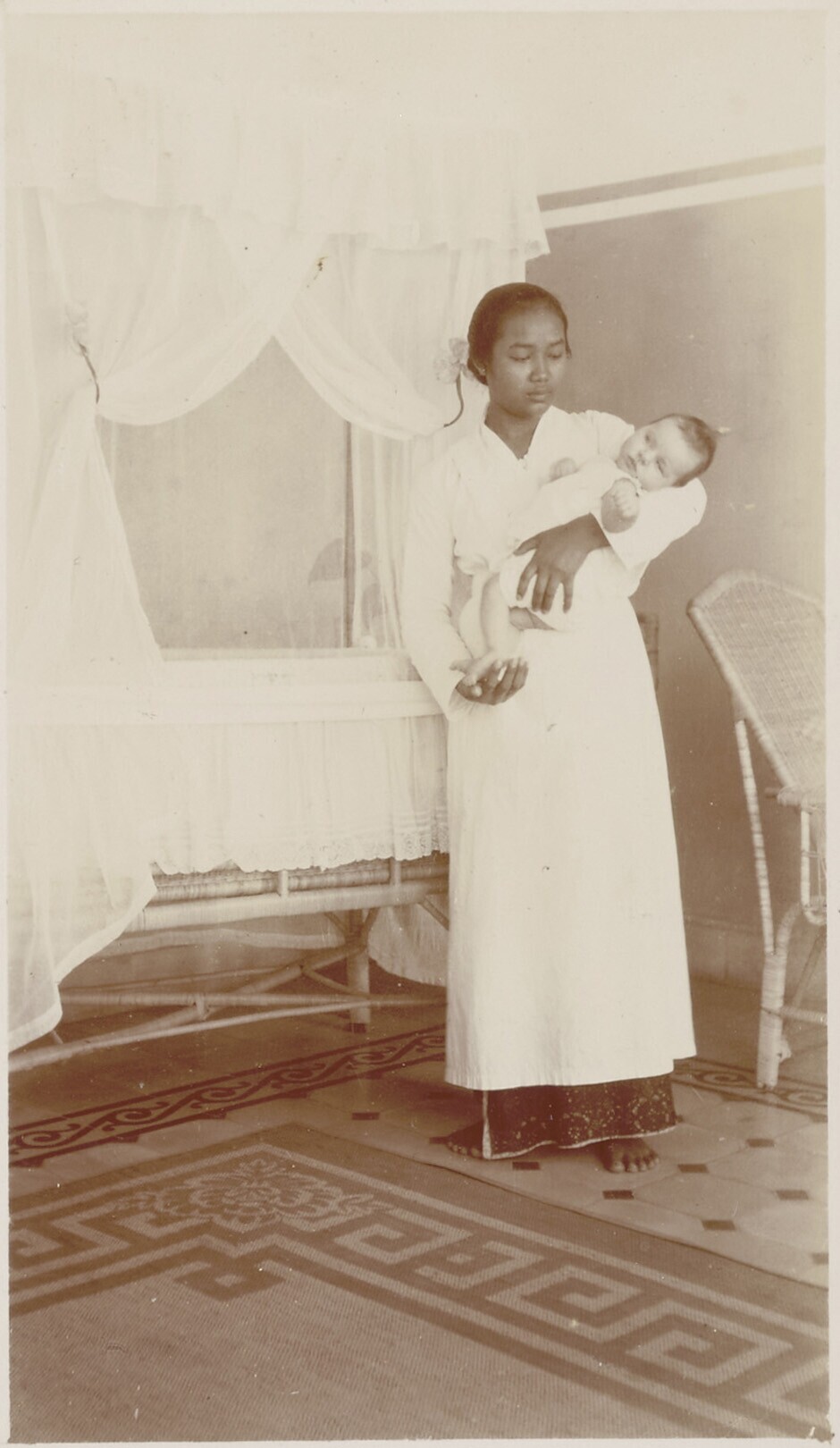 Mevrouw Kerchman met baby en kinderverzorgster in de...