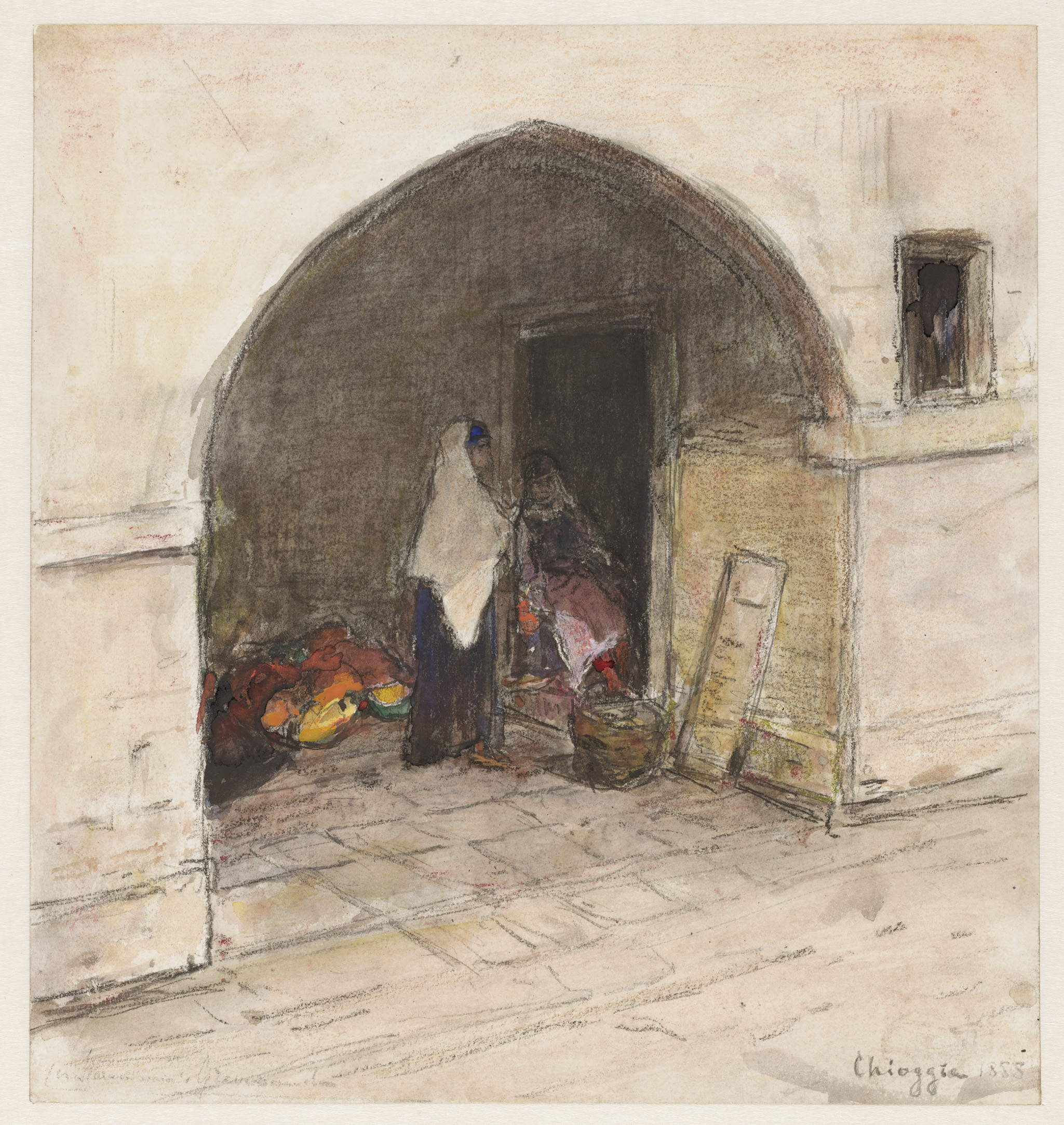 Straattafereel met oosters geklede vrouwen te Chioggia