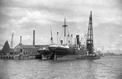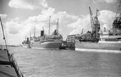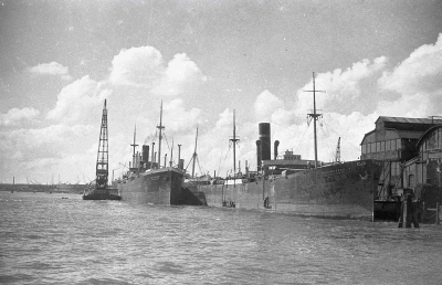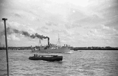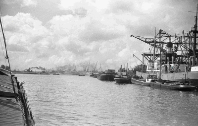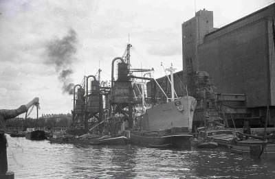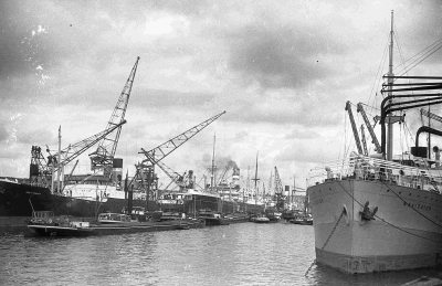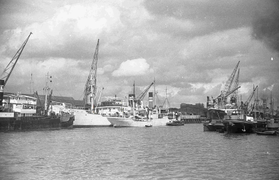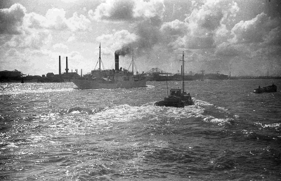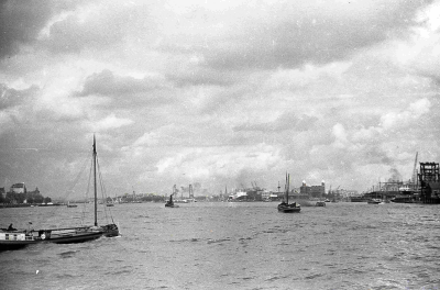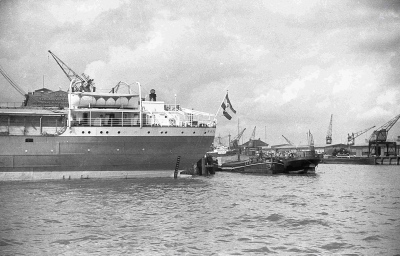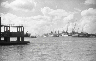 Schepen in de haven van Rotterdam. Links vooraan ver...