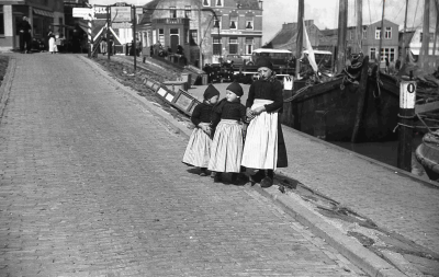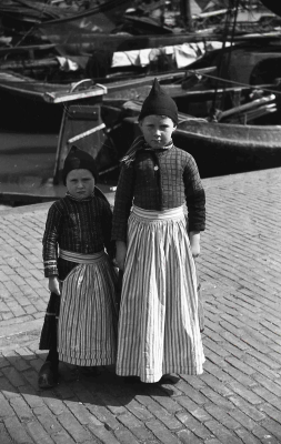 Kinderen in klederdracht in de haven van Volendam.