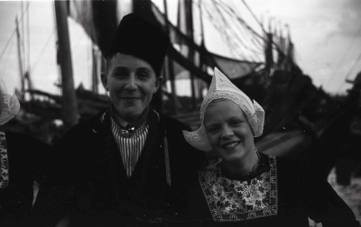 Jongen en meisje in klederdracht in de haven van Vol...