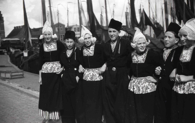 Groepje jongens en meisjes in klederdracht in de hav...