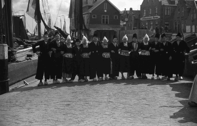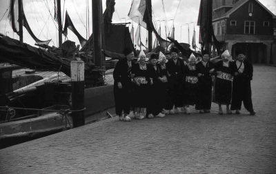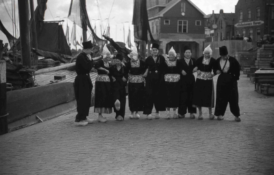 Groep mannen en vrouwen in klederdracht in de haven ...