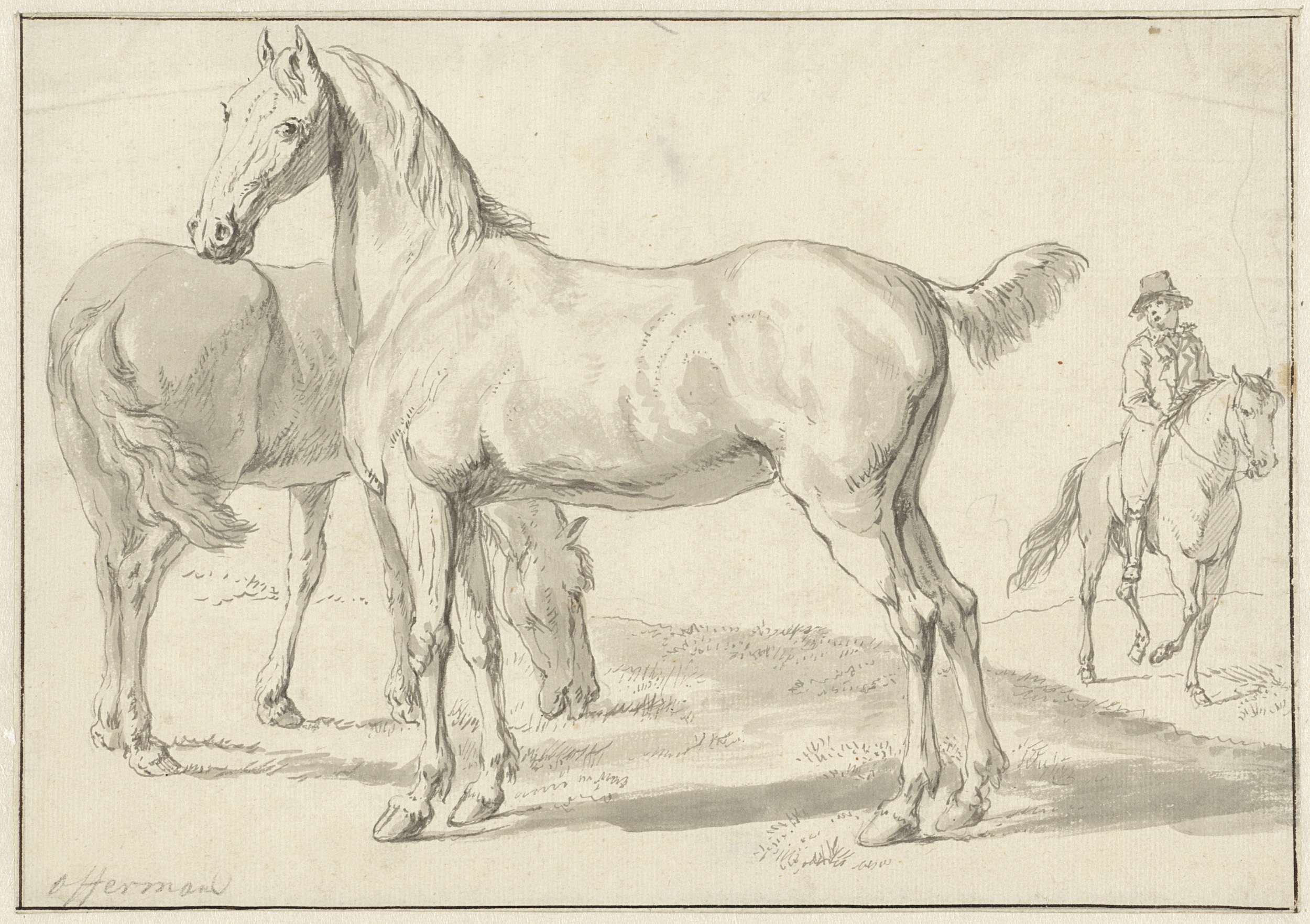 Twee paarden in een weide, rechts een ruiter