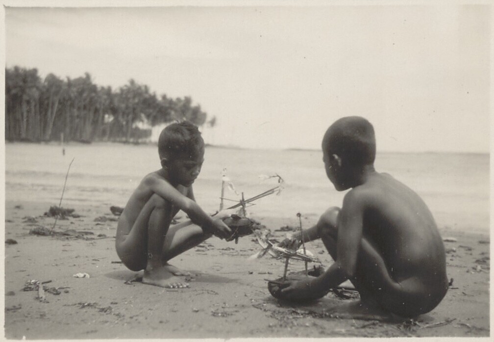 Twee jongens spelen met modellen van prauwen op het ...