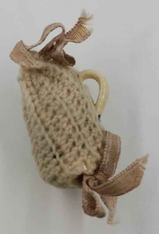 Crèmekleurige kan met oor in gebreide warmhoudzak.