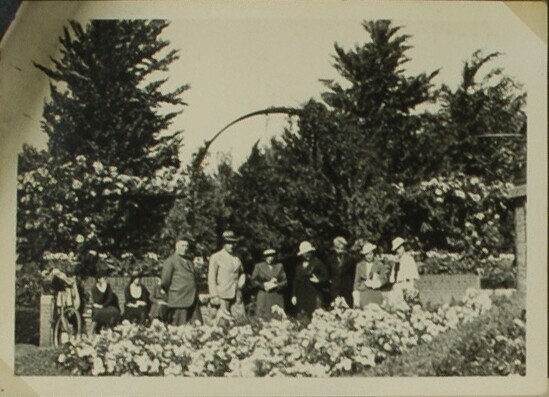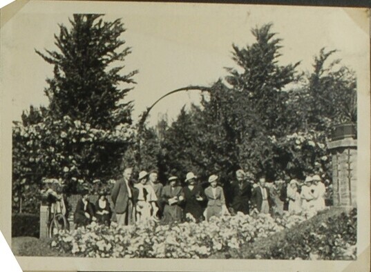 Groep mensen bij ingang park met bloemenperk