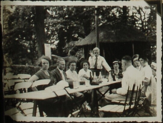 Groep mensen op terras bij restaurant