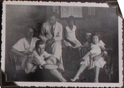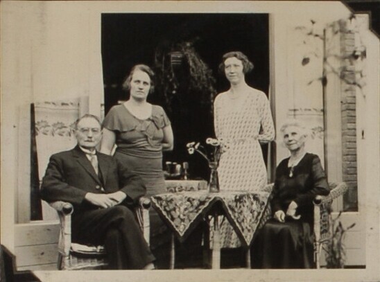 Groepsportret met ouder echtpaar bij open geslagen t...