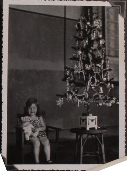 Kind met teddybeer in stoel naast kerstboom