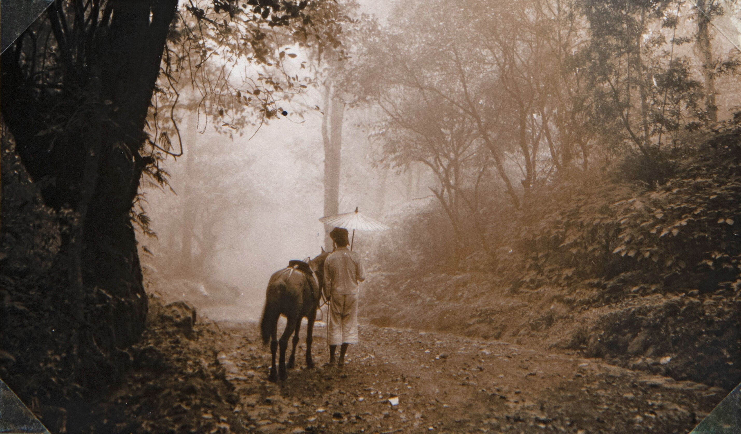 Een man met paard en parasol op een bospad in de omg...