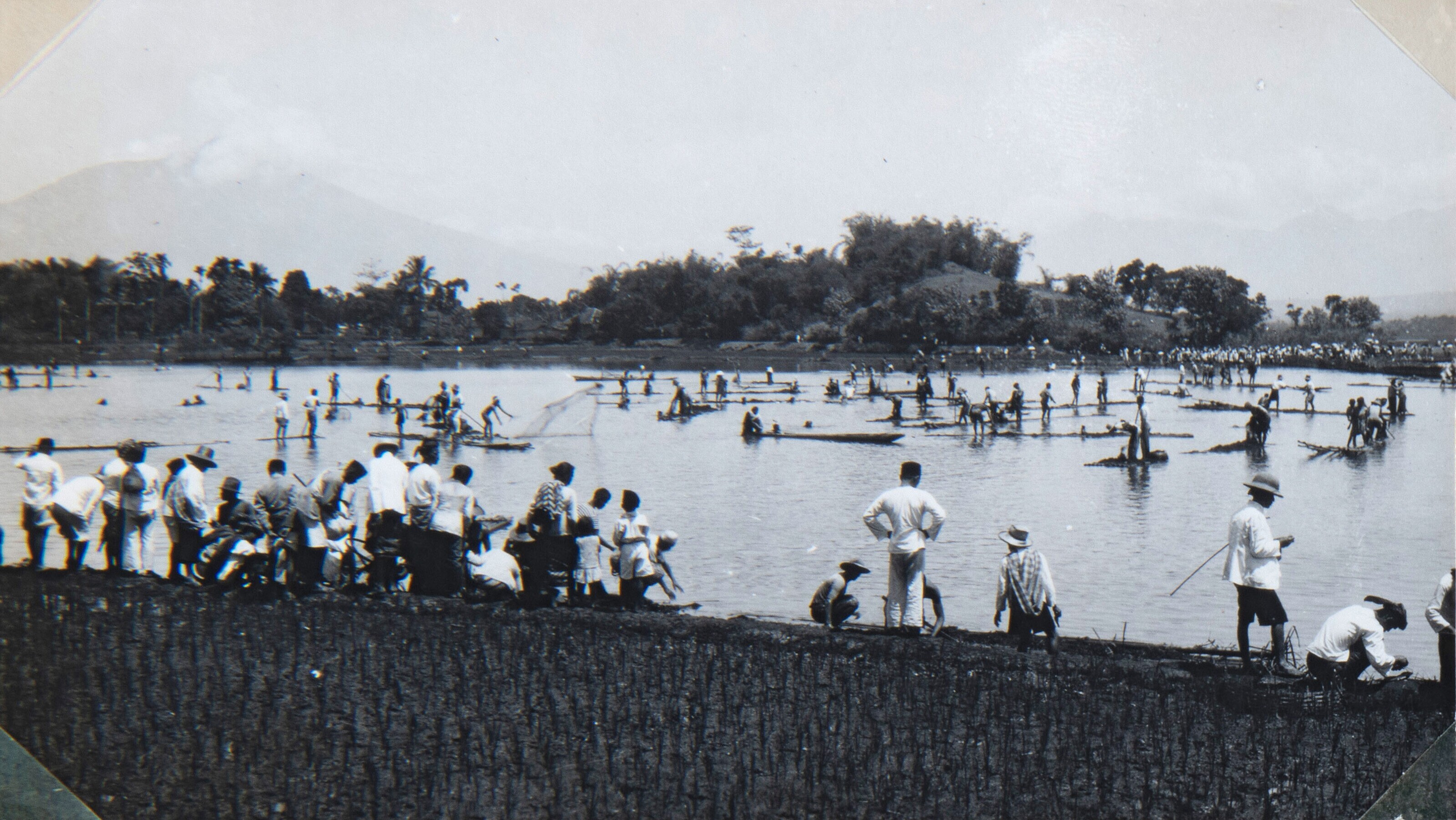 People fishing with proas and nets in a lake