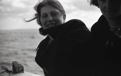 Gerdi Aalfs en een ander meisje op een zeilschip op ...