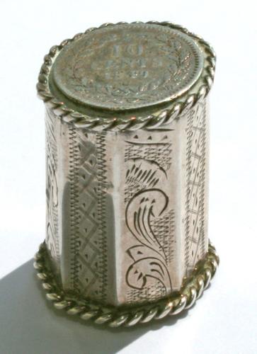 Muntendoosje. Een achtkantig cilindrisch model met d...