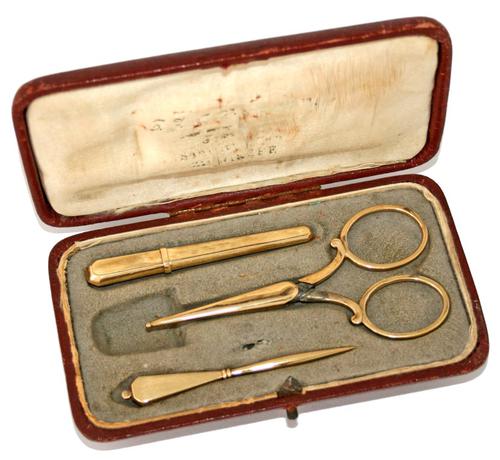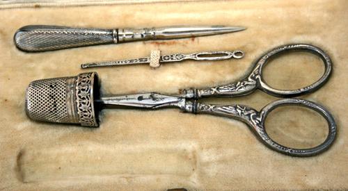 Naaigarnituur in etui bestaande uit een schaartje in...