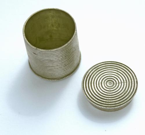 Muntendoosje. Geribd cilindrisch doosje met deksel