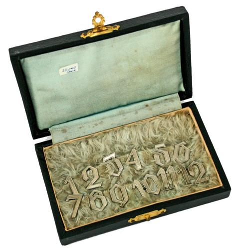 Zilveren glas nummers in zwart etui. Nummers 1 t/m 12.