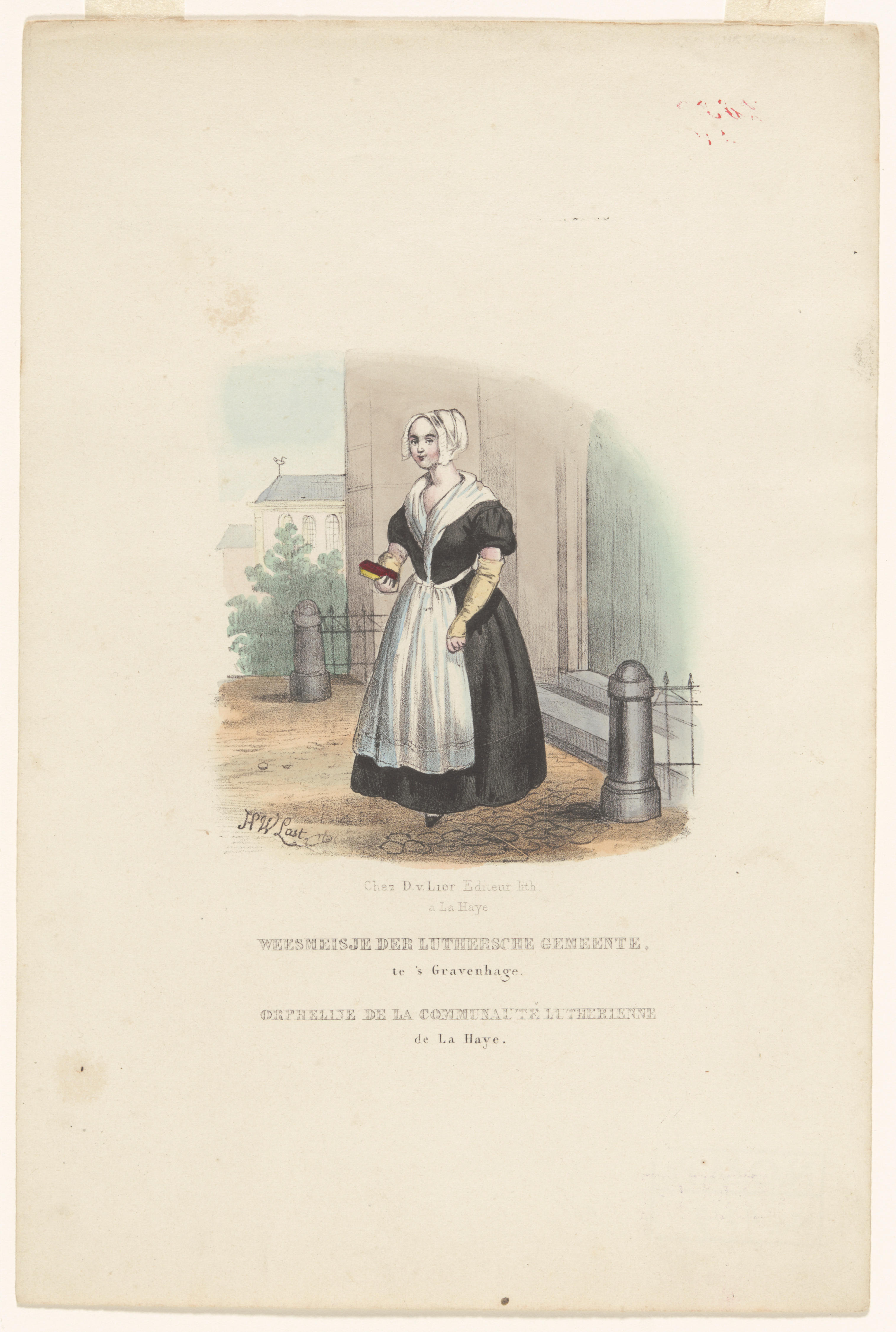 Prent van een weesmeisje uit Den Haag, circa 1850