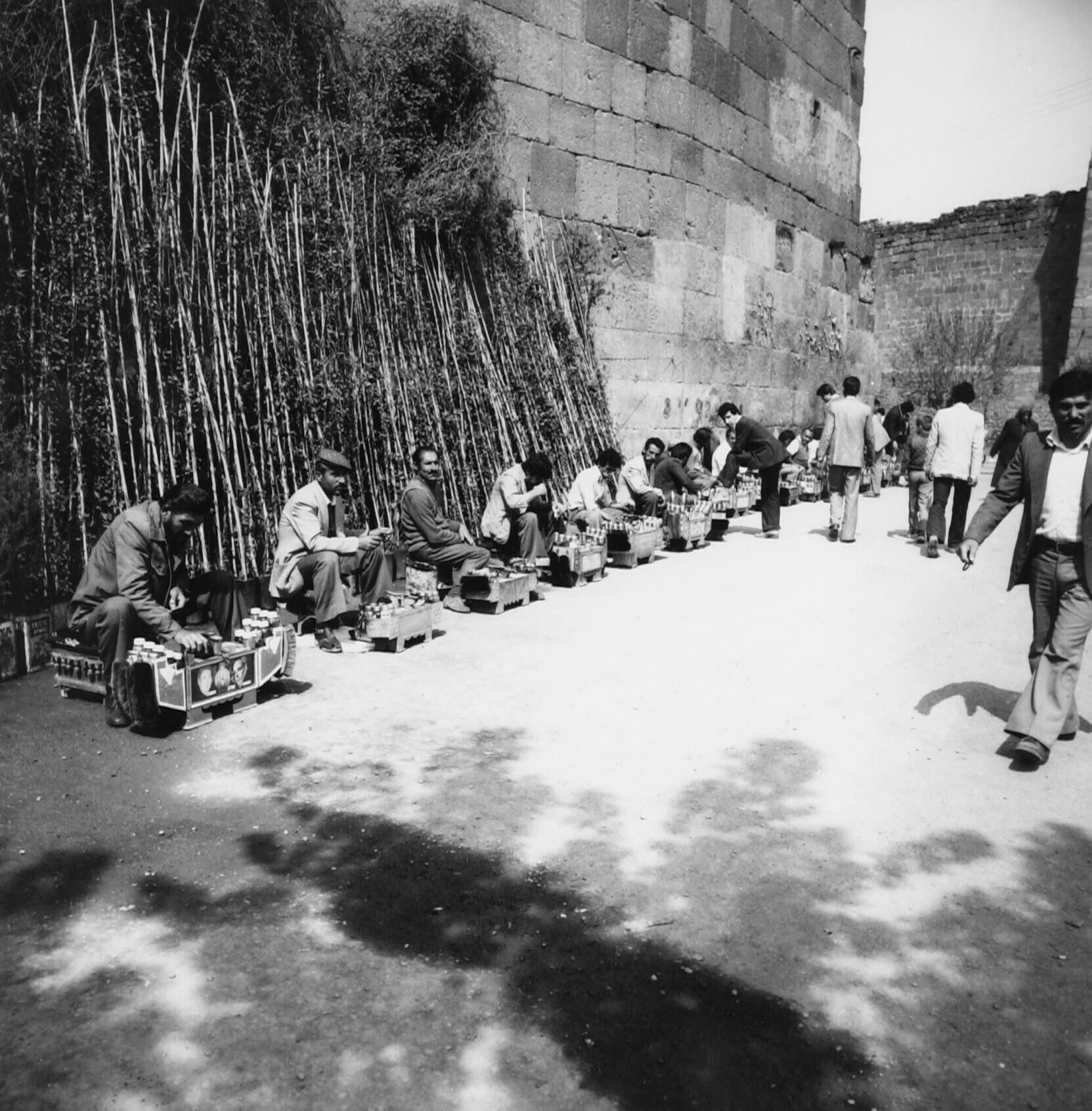 Een rij schoenpoetsers bij de muur van de Citadel