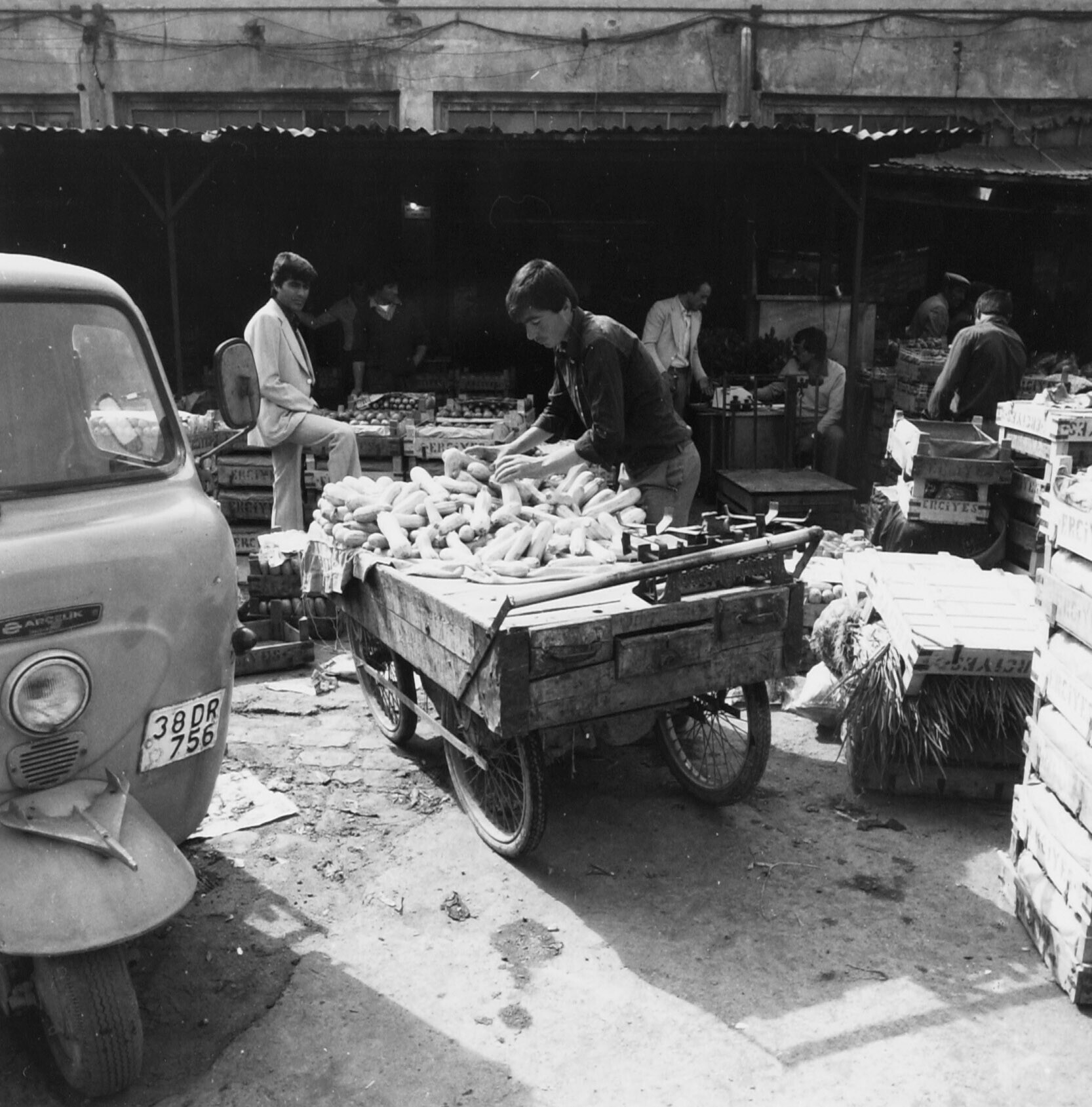 Een groenteventer laadt zijn kar op met groente om d...