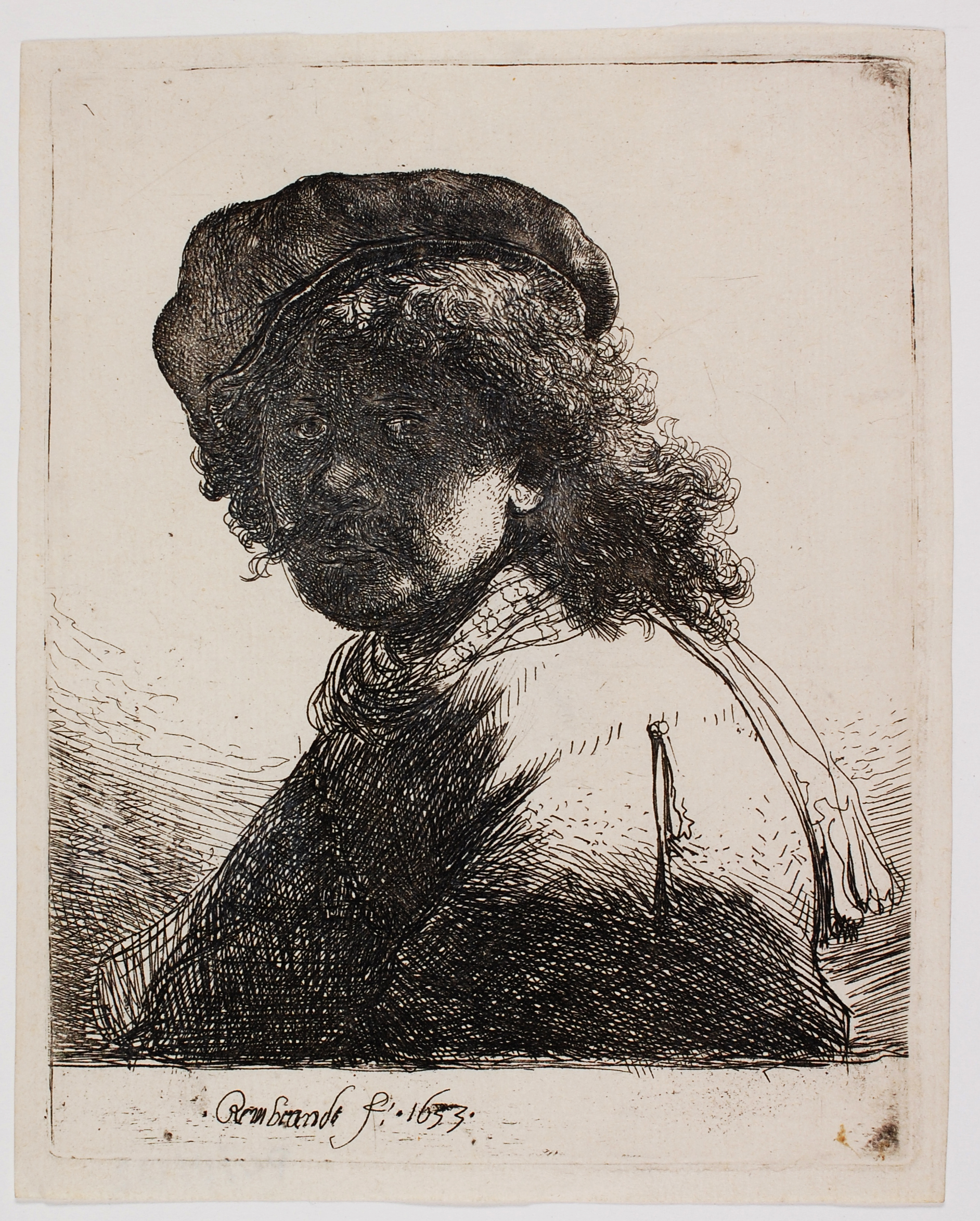 Zelfportret met baret en halsdoek, het gezicht in de...