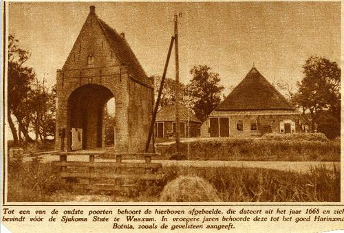 Knipsel in sepia met Sjukoma State te Waaxum