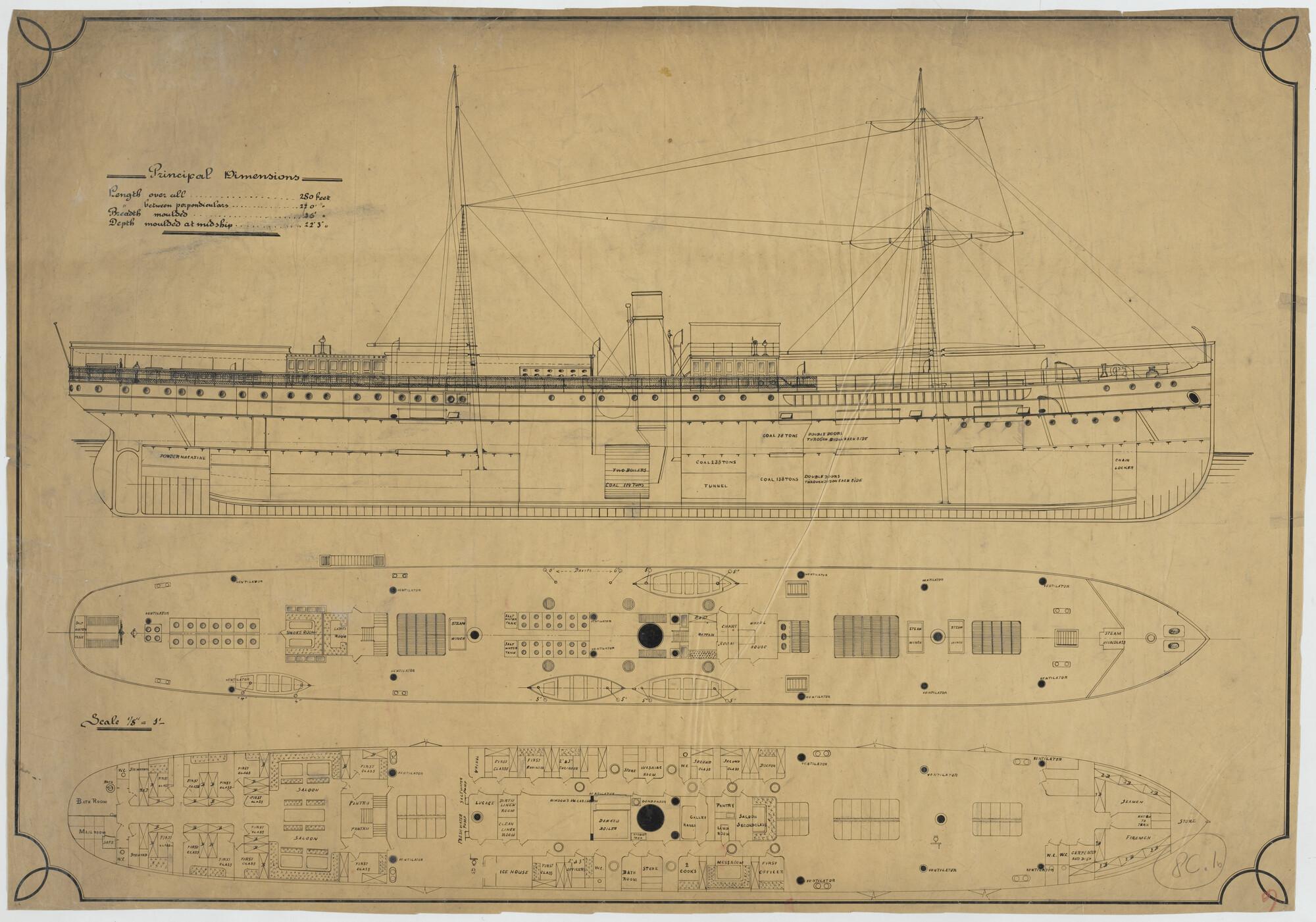 Zijaanzicht en dekplannen van het passagiersschip ss...