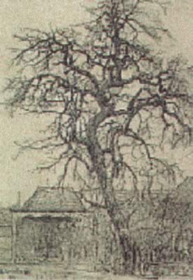Bladerloos appelboompje voor houten schutting