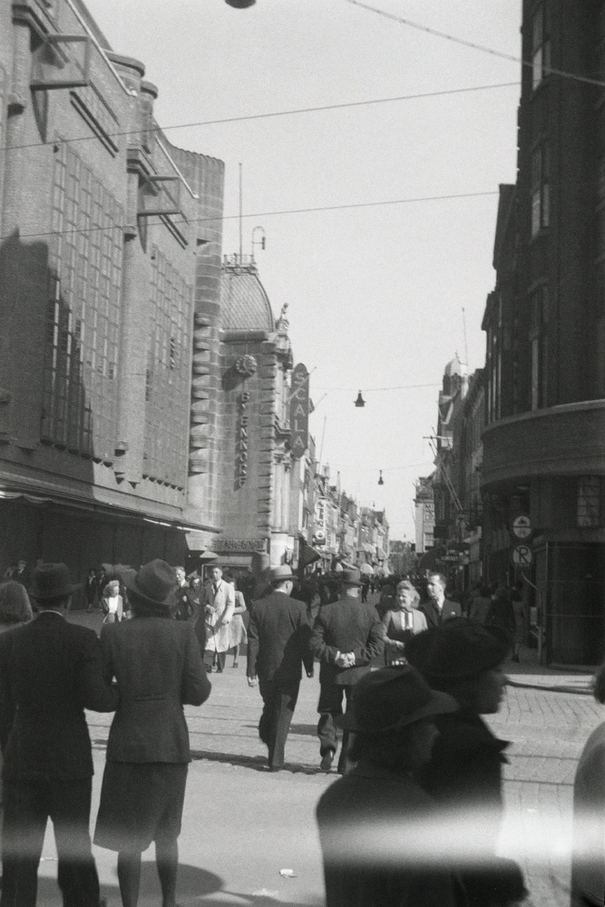 Drukte in de Wagenstraat in Den Haag, links de Bijen...