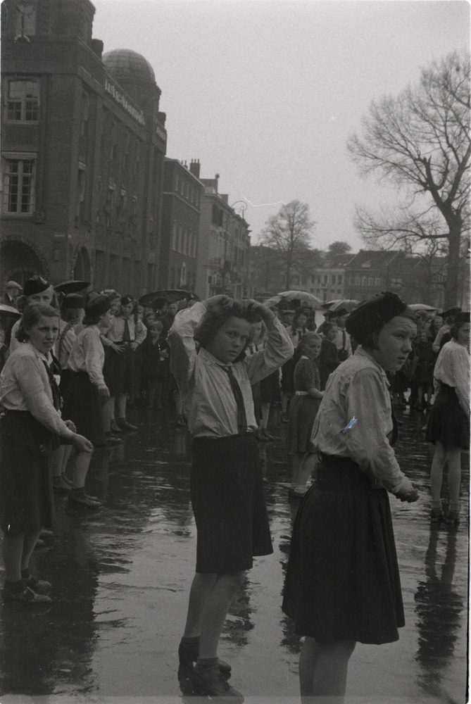 Meisjes van de Nationale Jeugdstorm staan in de rege...
