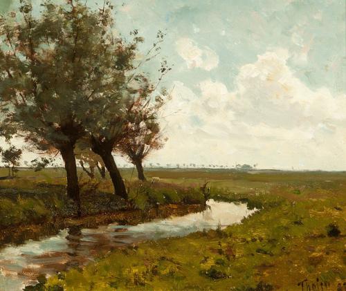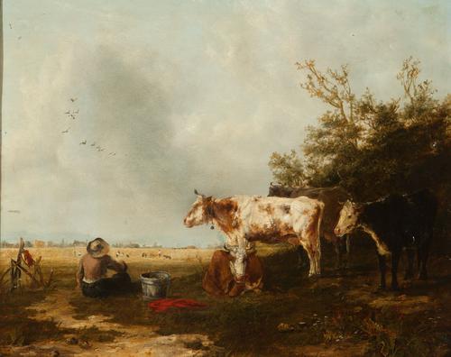 Landschap met koeien en een zittende figuur bij een ...