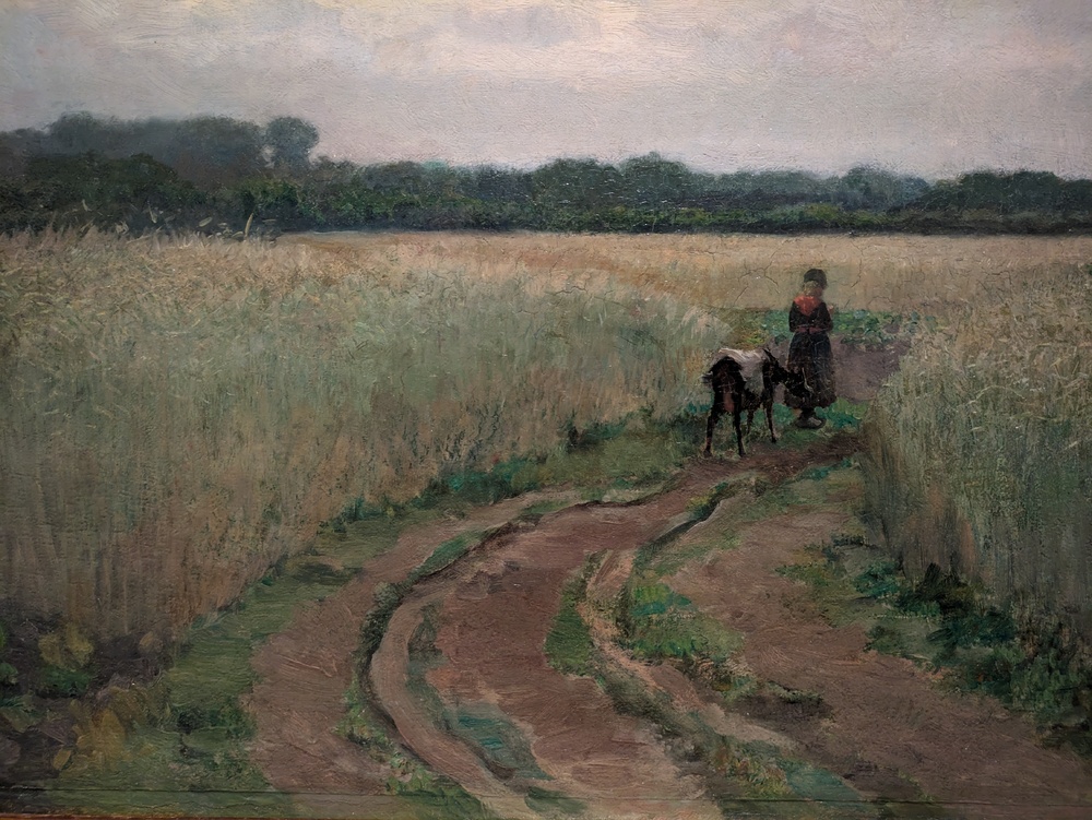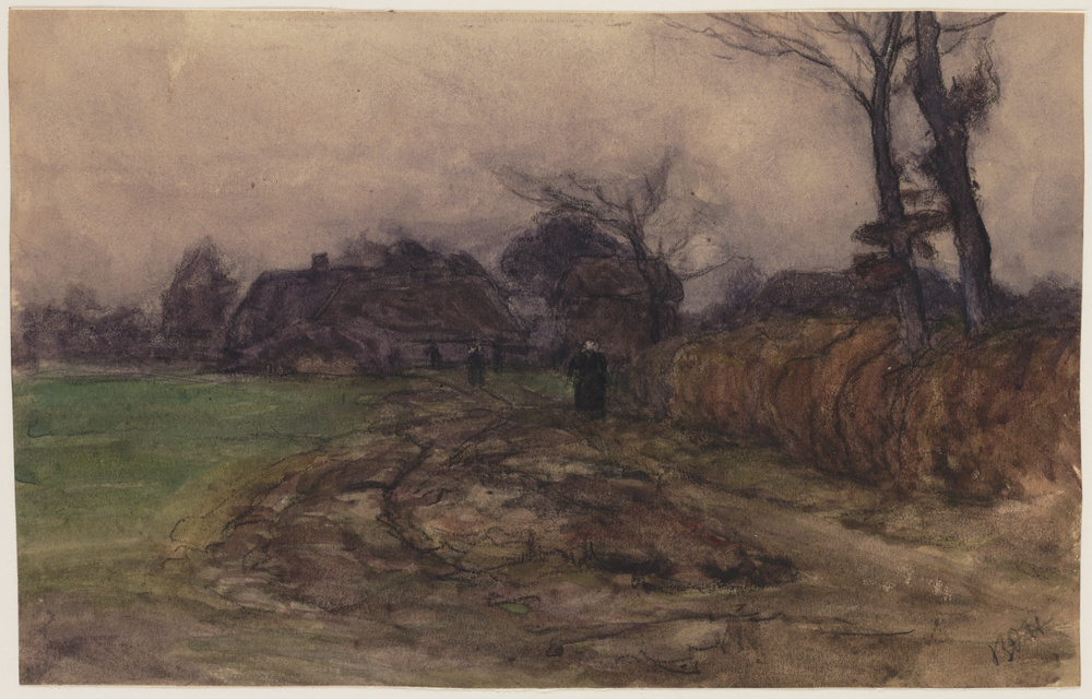 Landschap met boerderij en twee boerinnen