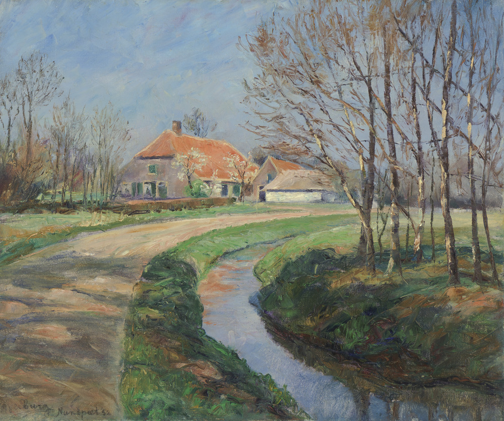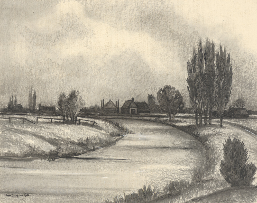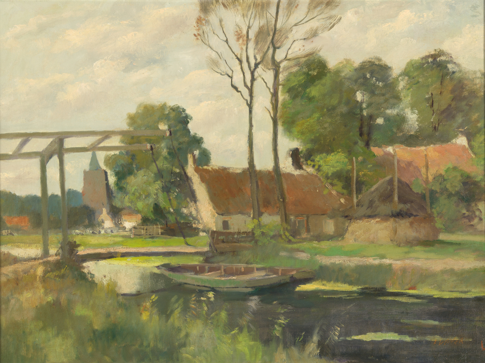 Landschap met boerderij aan het water
